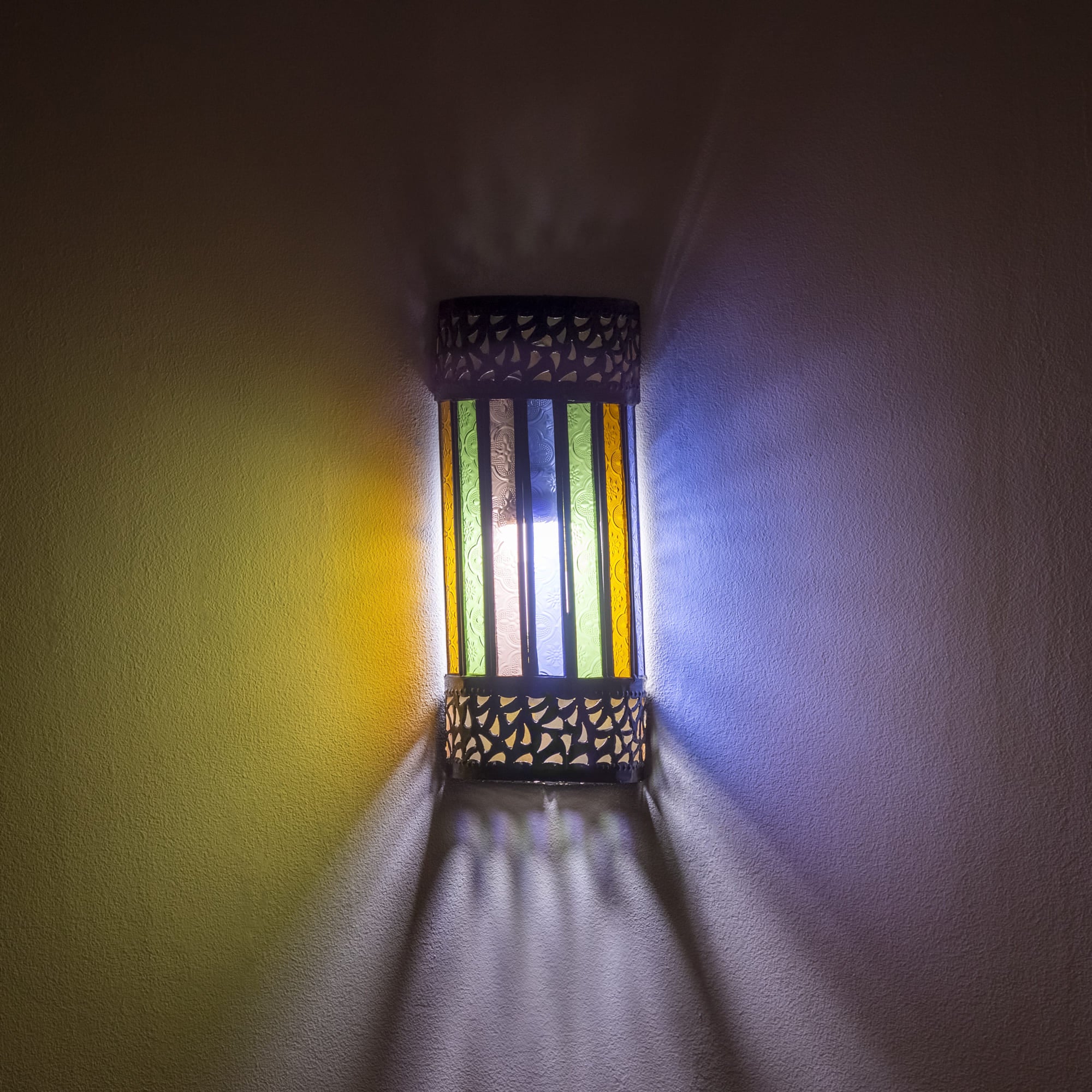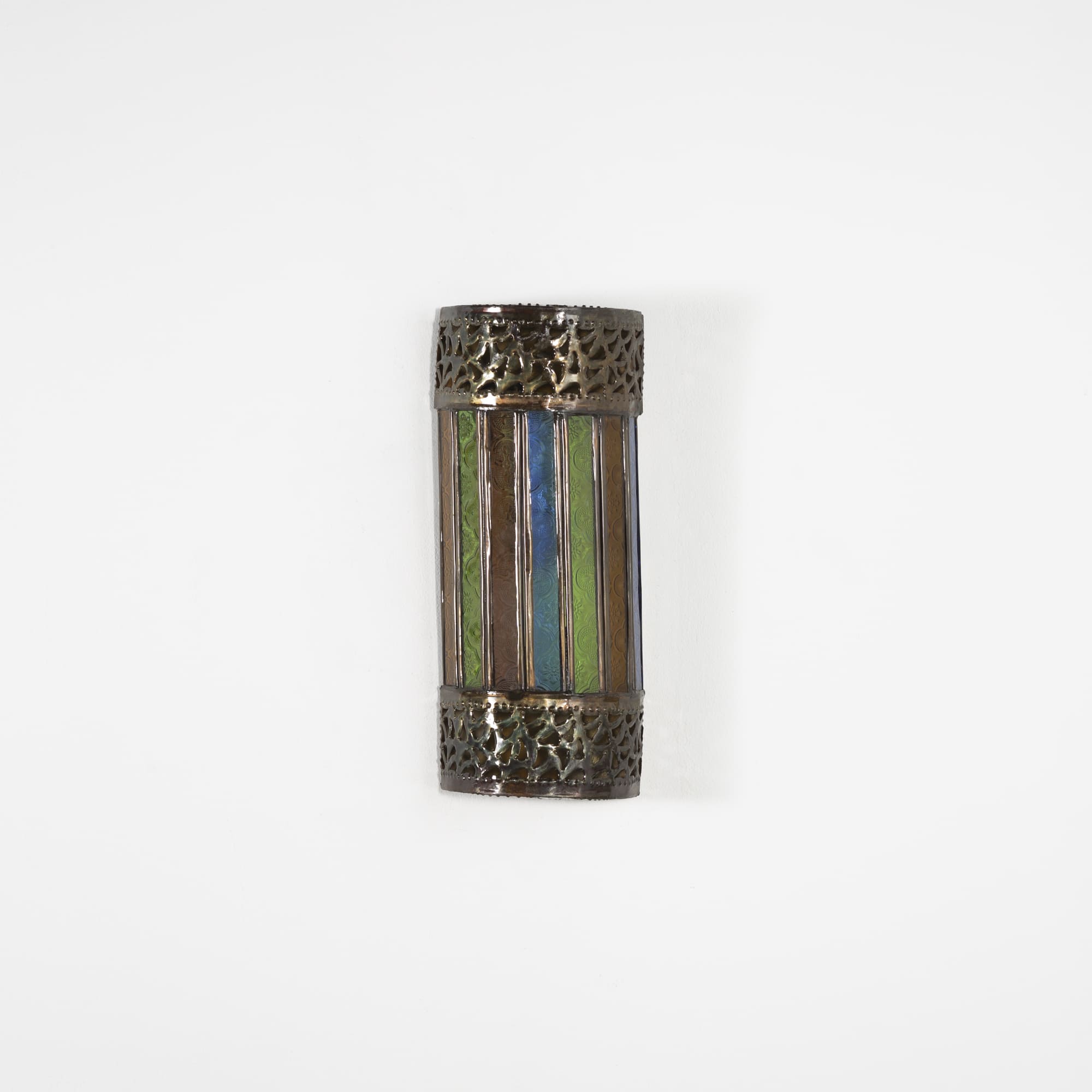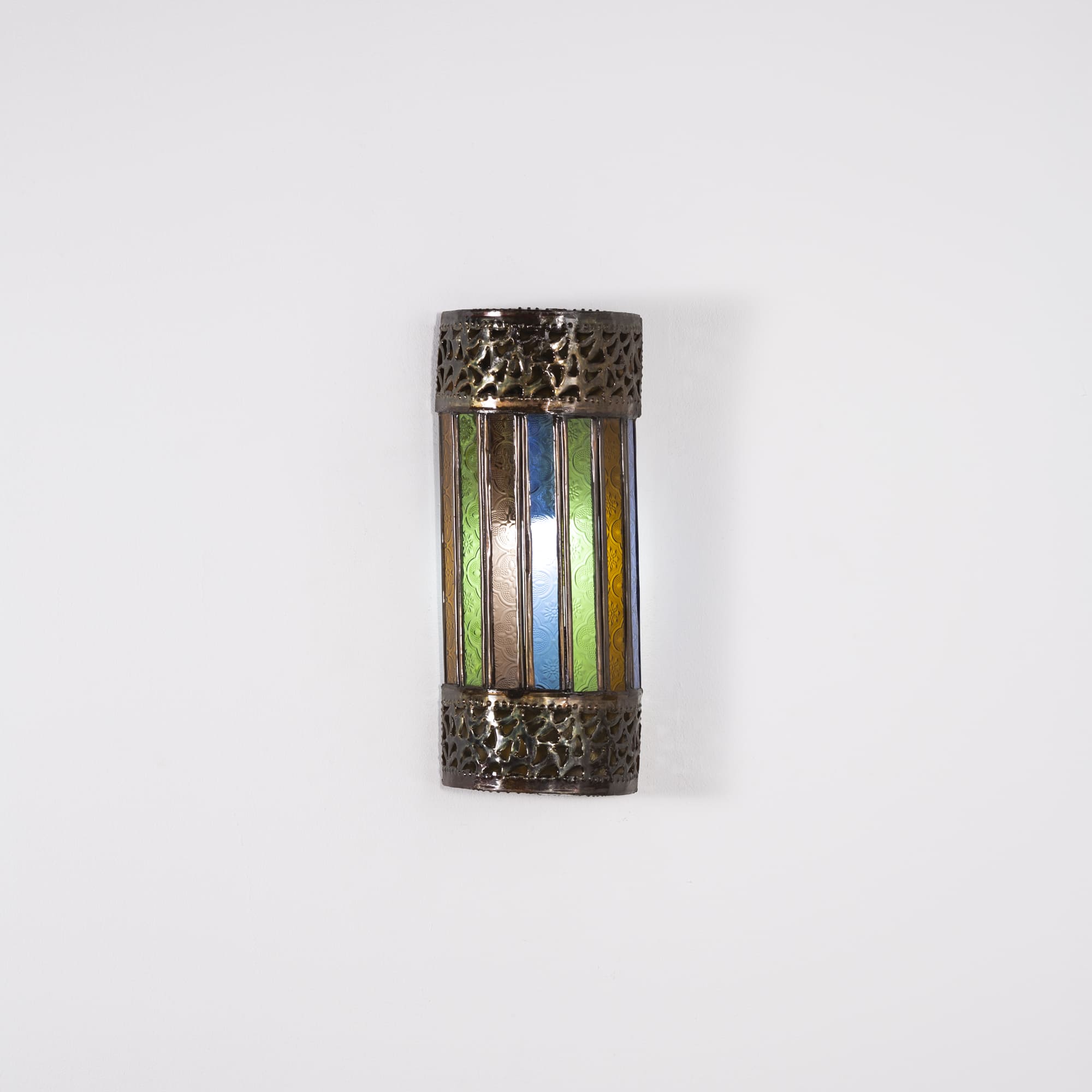 Elegante applique marocchina a forma di semicilindro, con vetro smaltato multicolore e aperta nella parte superiore e inferiore. Diffonde una luce armoniosa creando un motivo geometrico a mosaico alle estremità.