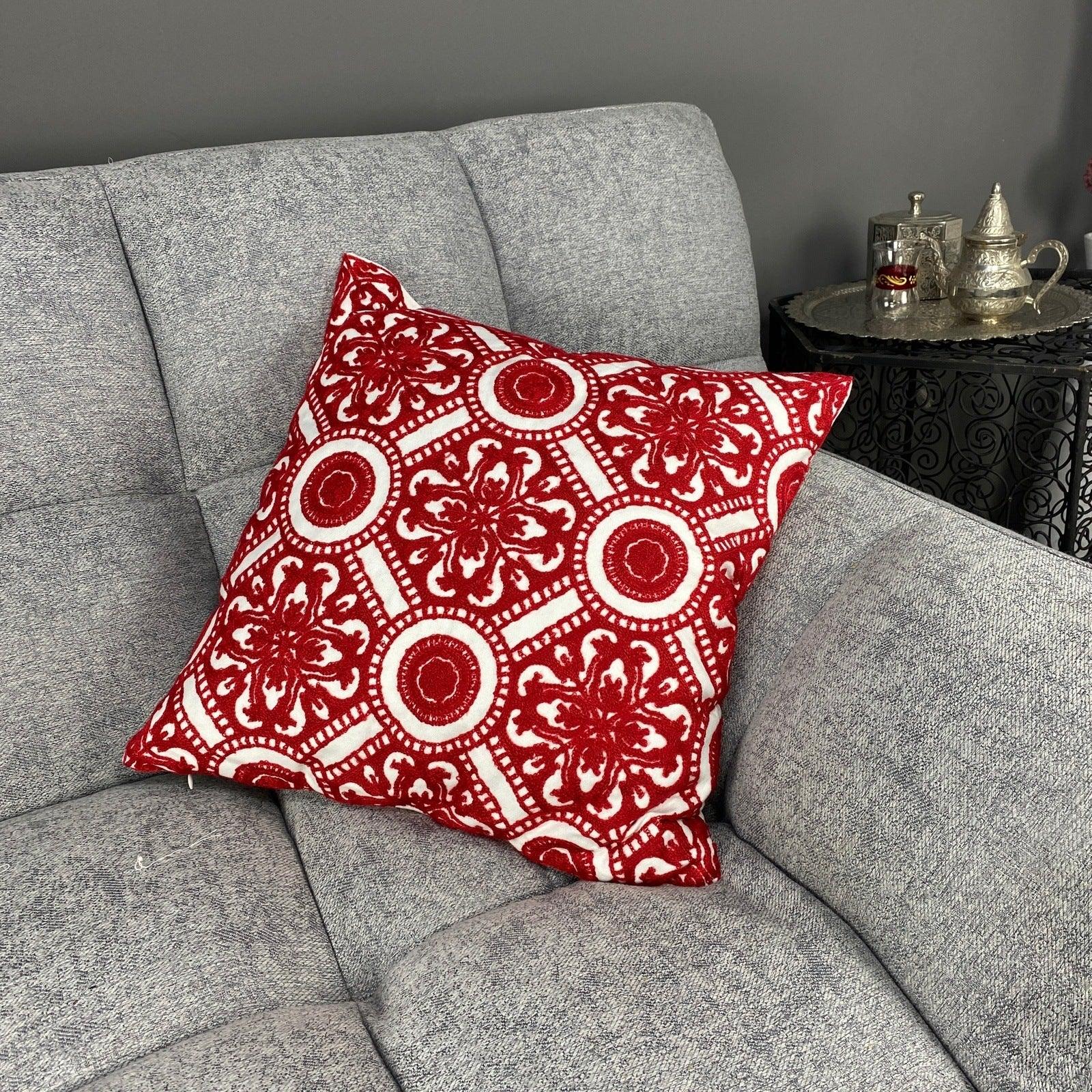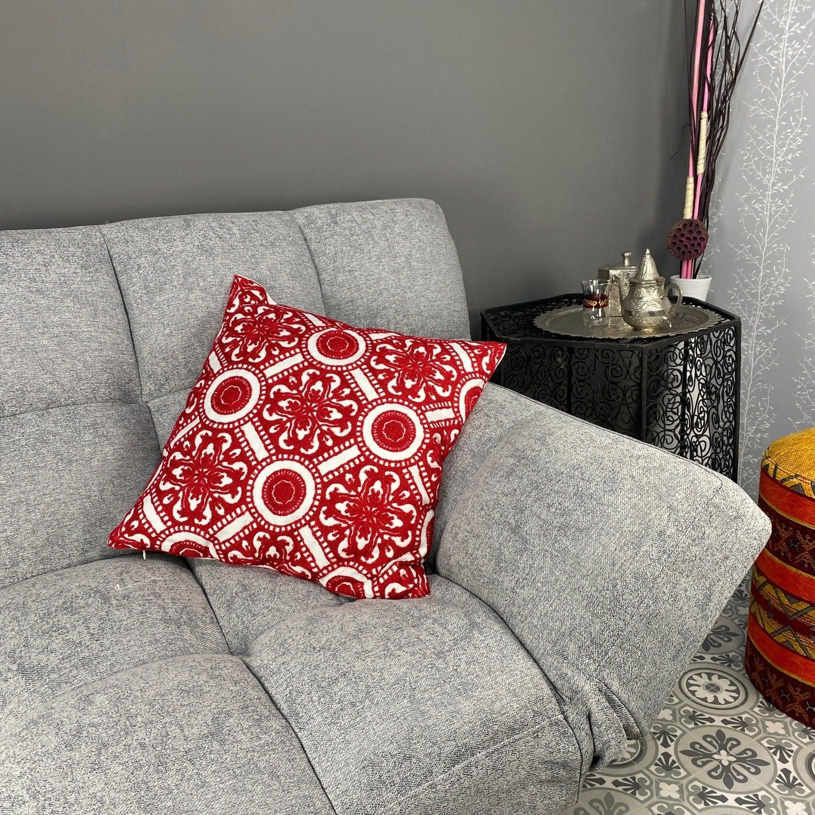 Fodera per cuscino in stile arabo con motivo floreale rosso, modello MK6. Queste fodere per cuscini pouf sono uniche e disponibili in quantità limitata. Aggiungete un tocco arabo essenziale per ravvivare i vostri soggiorni, salotti e camere da letto con questo look esclusivo che i moderni cuscini arabi sanno offrire.