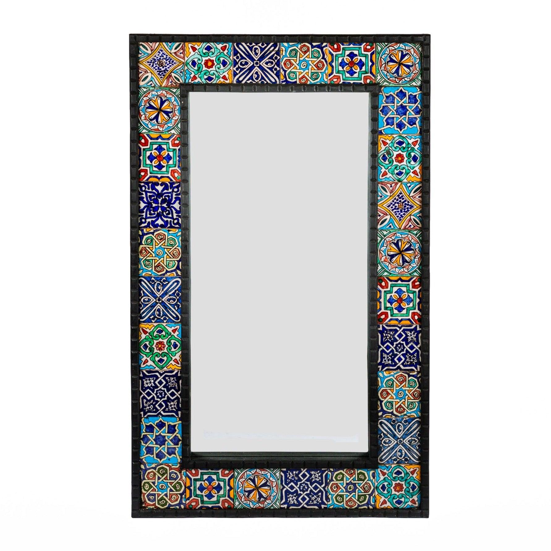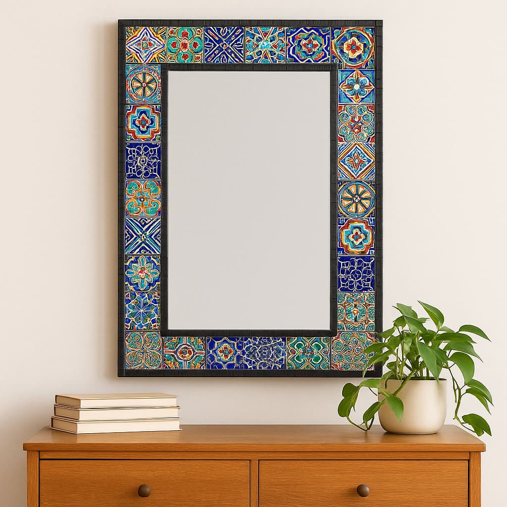 Specchio in stile arabo, realizzato in robusto legno di pino dello spessore di 4 cm. Questi specchi in stile berbero marocchino sono eleganti, moderni e sofisticati nel design, perfetti per arredare soggiorni, corridoi e camere da letto in stile arabo. Sono dotati di staffe sul retro per l'appendimento verticale, ma possono essere adattati anche per l'appendimento orizzontale.