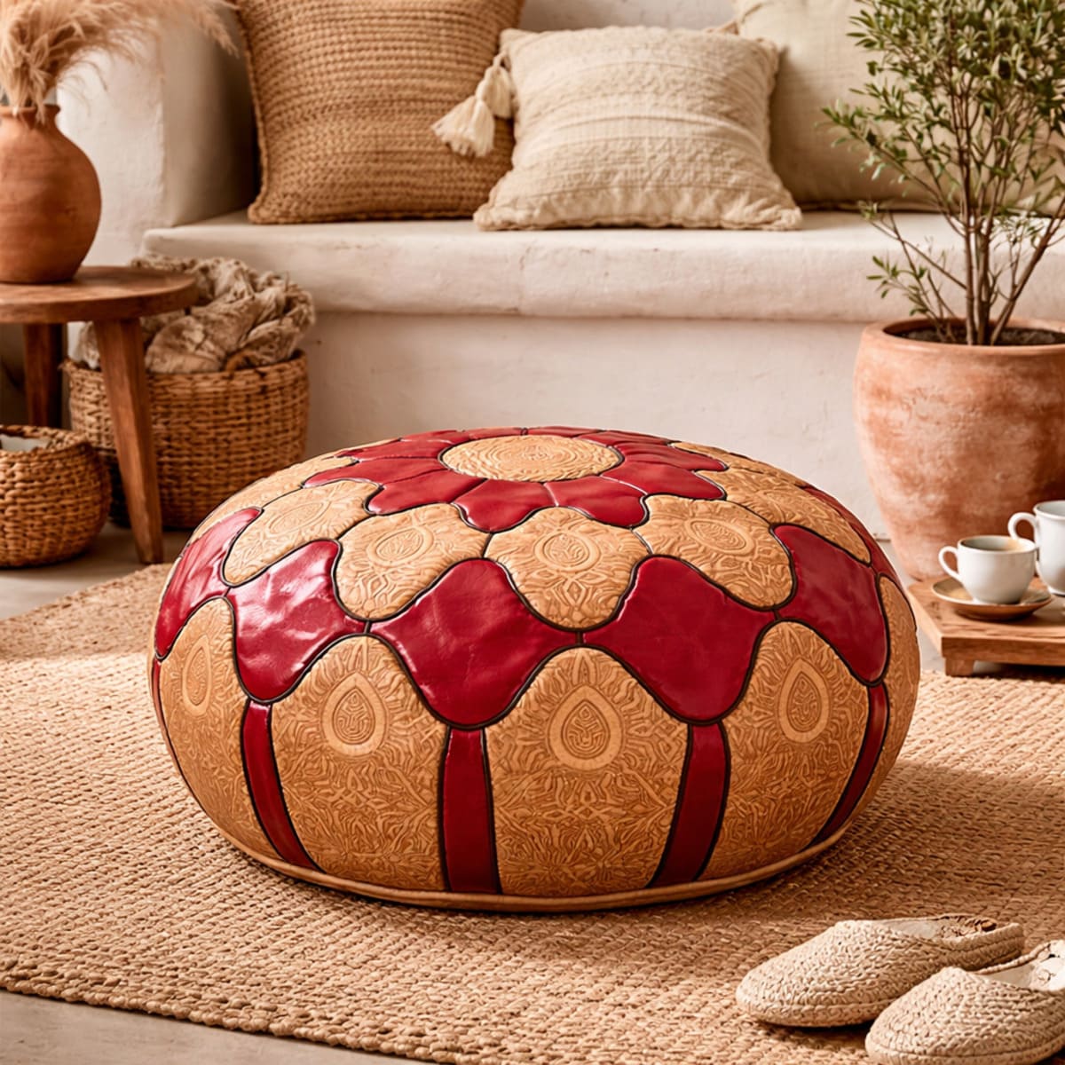 Prodotto in Pelle naturale, lavorata a mano in Marocco, Unisce tradizione e funzionalità in un formato versatile: può essere utilizzato come seduta aggiuntiva, poggiapiedi o elemento decorativo.
