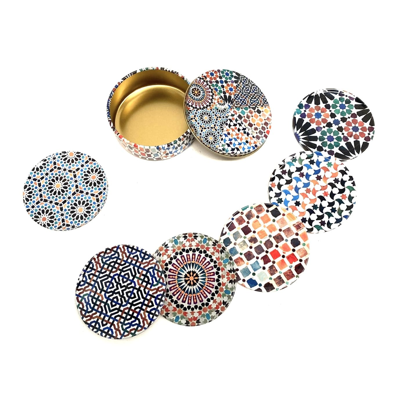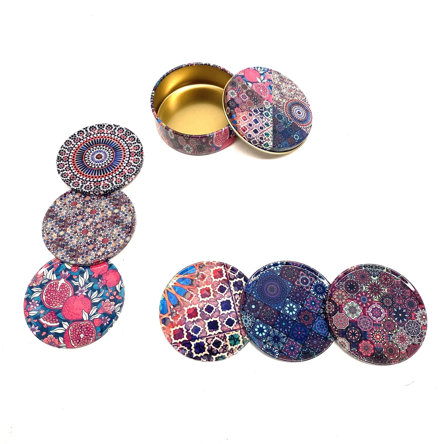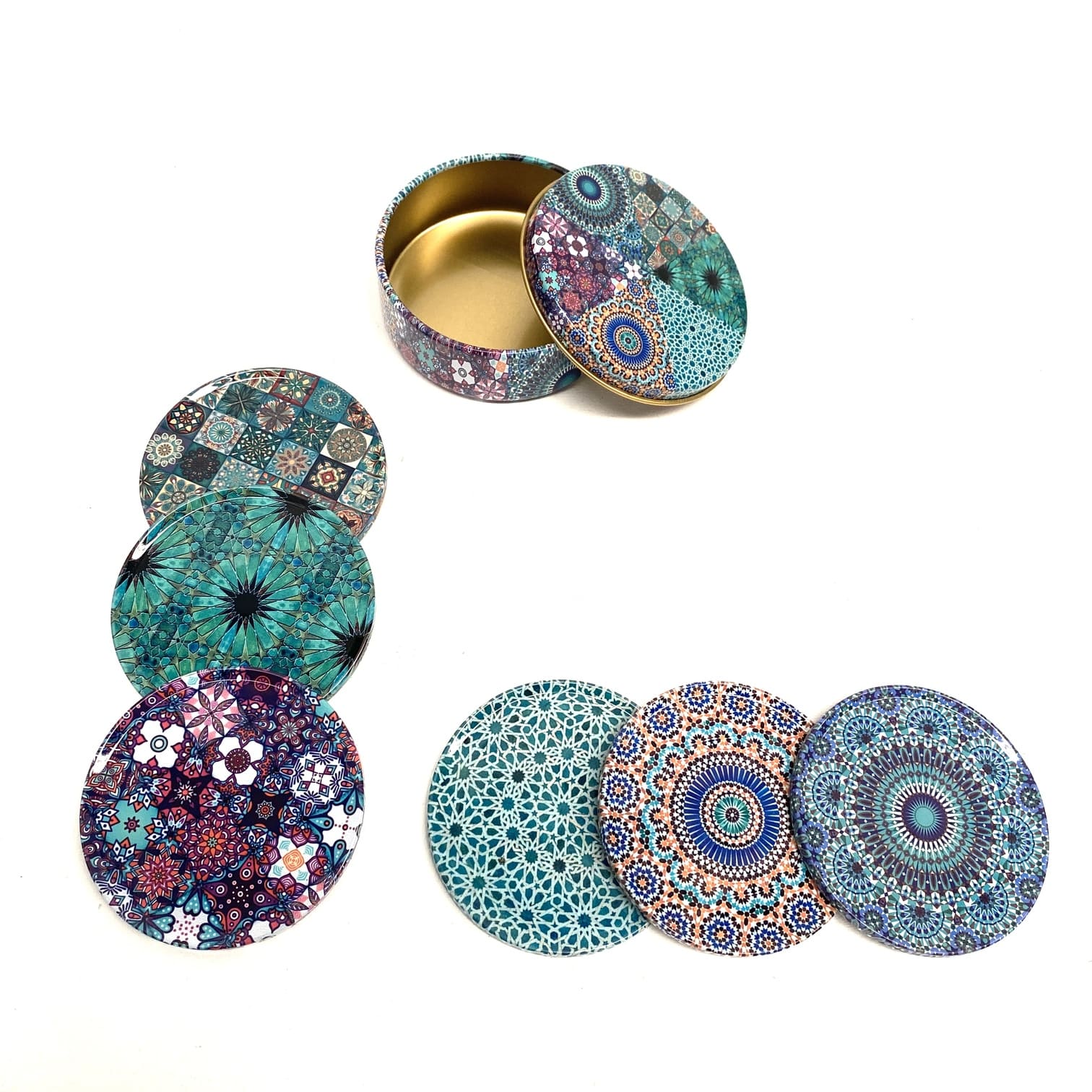 Il set di sottobicchieri include una scatola di metallo per riporli.