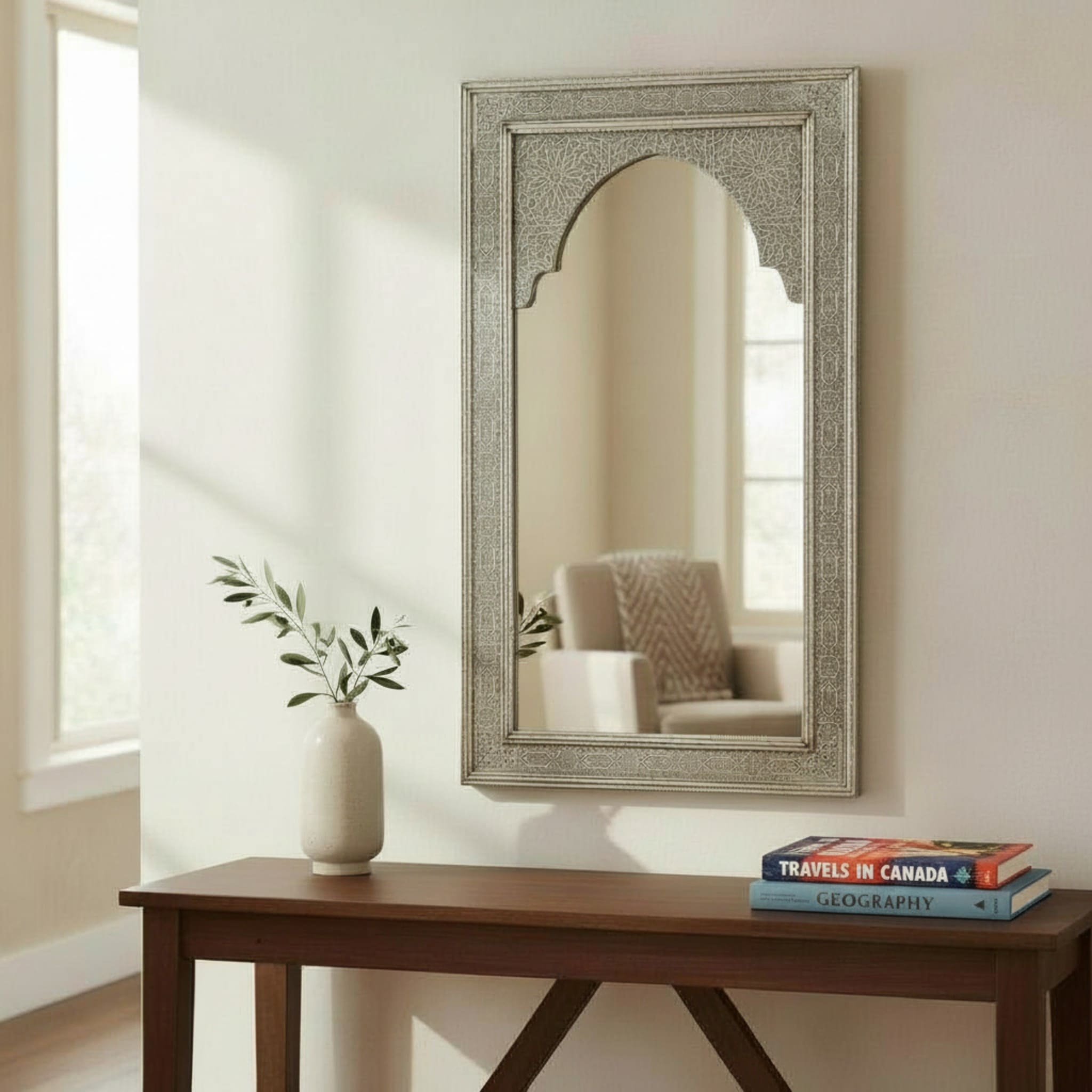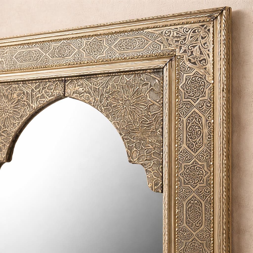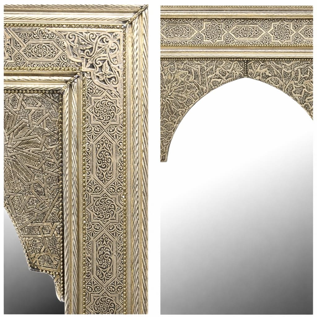 Specchio marocchino in legno con rivestimento in alpaca, tradizionale arco marocchino. Design arabo moderno. Decorativo per bagni, camere da letto, corridoi, ingressi, ecc. Modello Arco Elvira.
