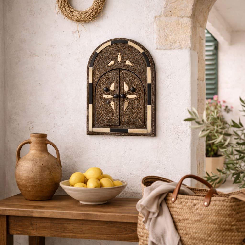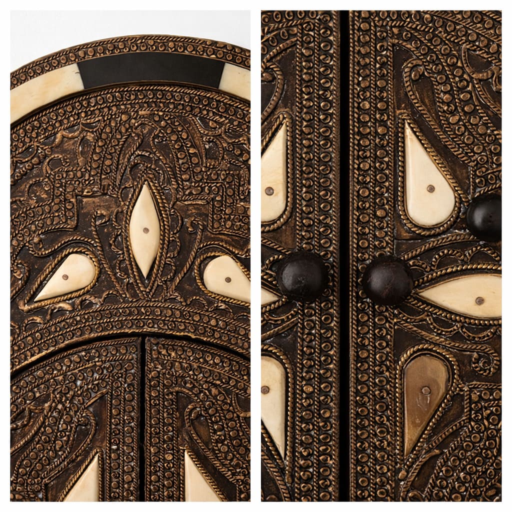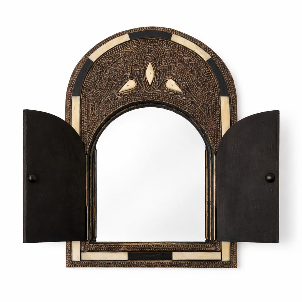 Specchio arabo in osso, modello BOU REGREG, con ante. Questo pezzo speciale è intagliato a mano in osso bianco e argento di alpaca. I nostri artigiani utilizzano metodi ancestrali per realizzare questo tipo di specchio.