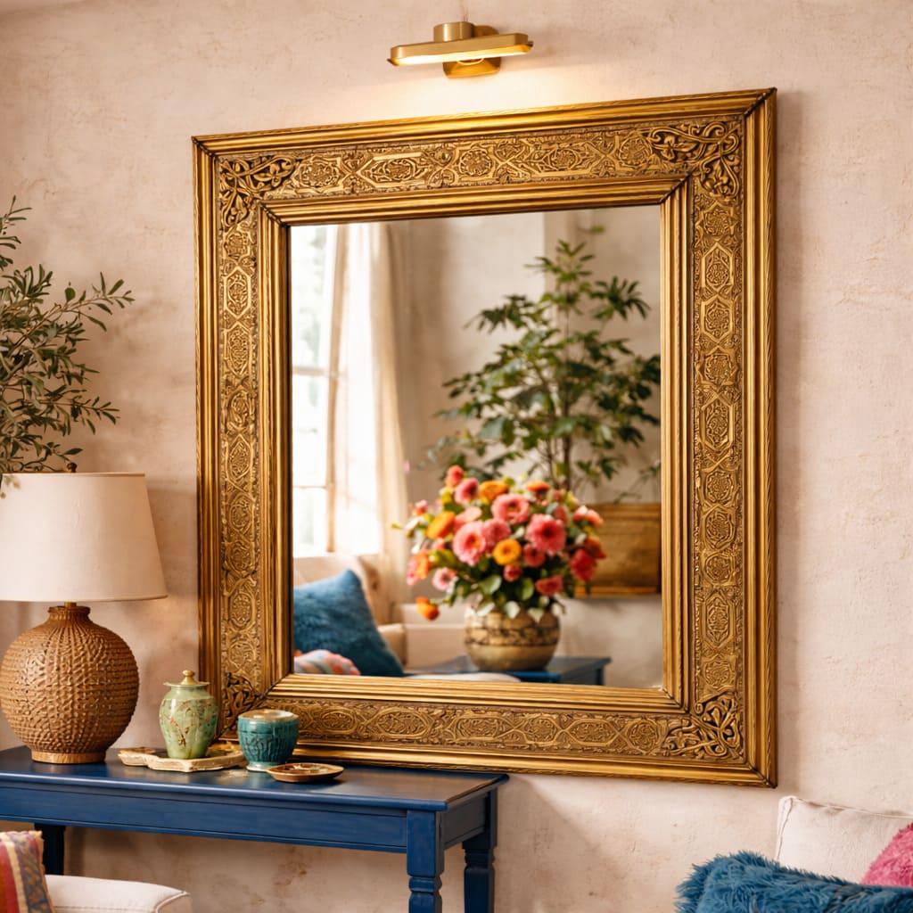 Realizzato a mano, questo specchio dorato ispira eleganza, modernità e un sorprendente tocco andaluso.