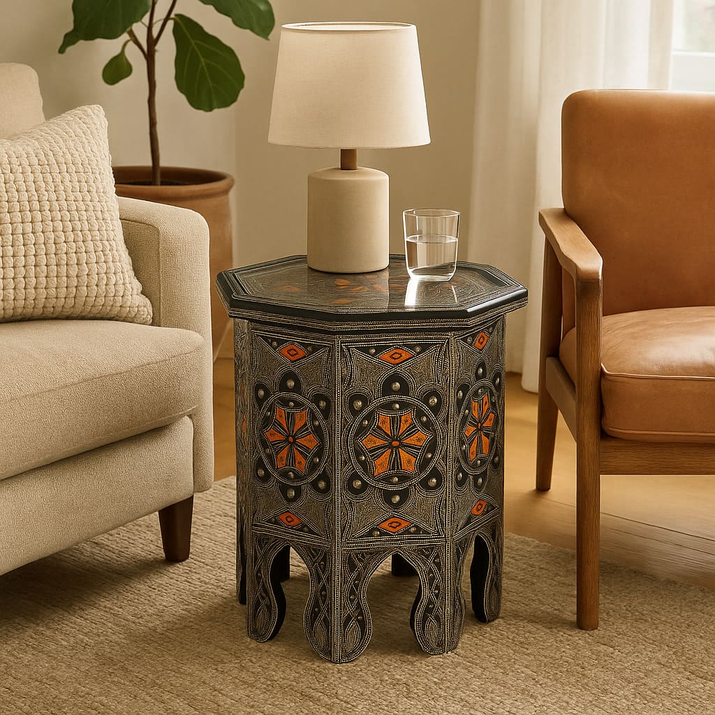 Questo tavolo marocchino, realizzato a mano con meticolosa cura per i dettagli, impreziosirà i vostri ambienti con un'impressionante serie di figure geometriche intagliate a mano da artigiani esperti. Presenta intarsi in osso naturale al 100%, ogni pezzo posizionato singolarmente.