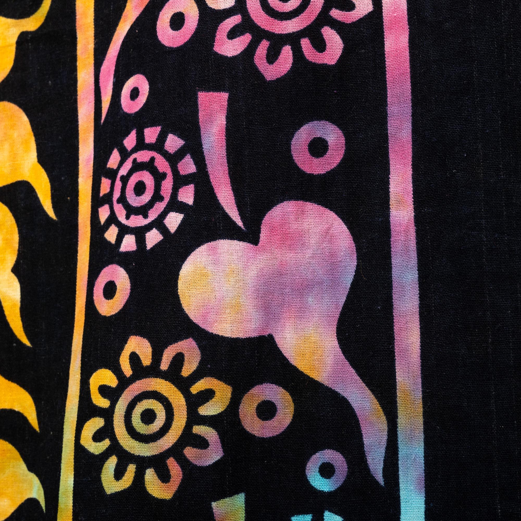 Tessuto indiano dai colori vivaci, raffigurante l'Albero della Vita e un magico elefante induista ai suoi piedi. L'elefante simboleggia la protezione della famiglia e della casa, la buona sorte e l'abbondanza nel senso più ampio del termine.
