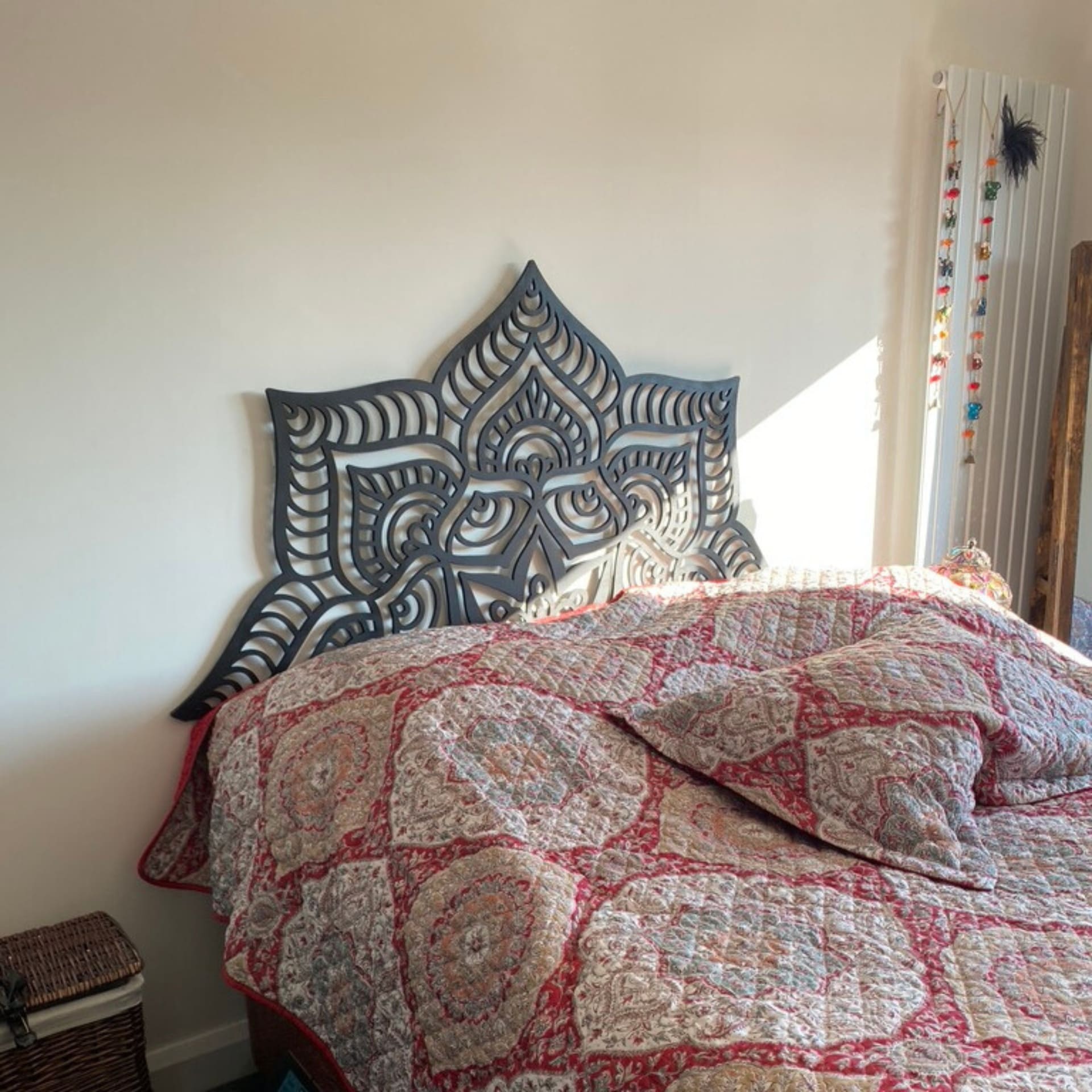 Testiera da letto di 160 cm, realizzata con griglia di legno. Ideale per creare un arredamento orientale, moderno e rilassante. Decorazione Warda con motivi floreali orientali. Realizzata in legno laminato, include staffe per appenderla a parete.