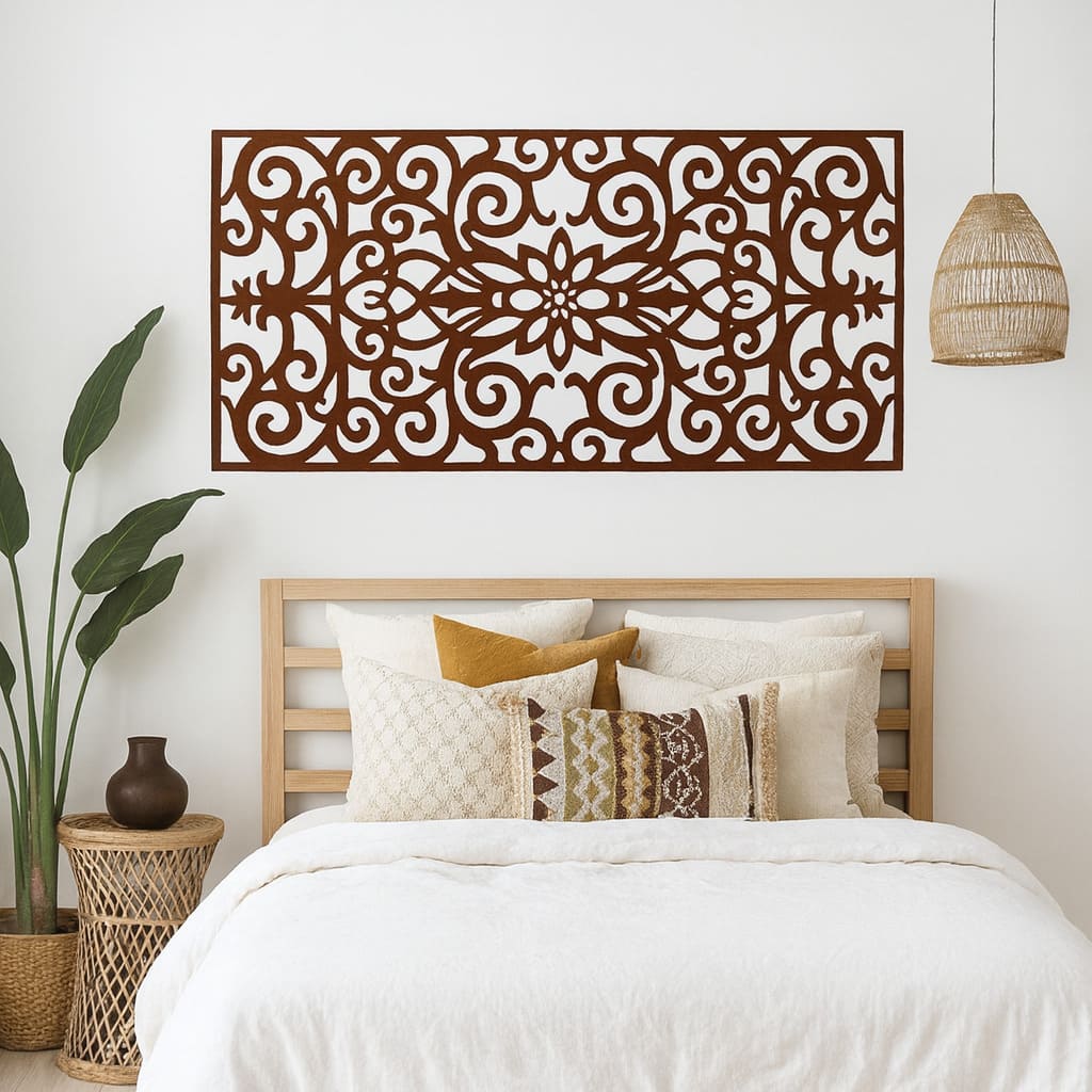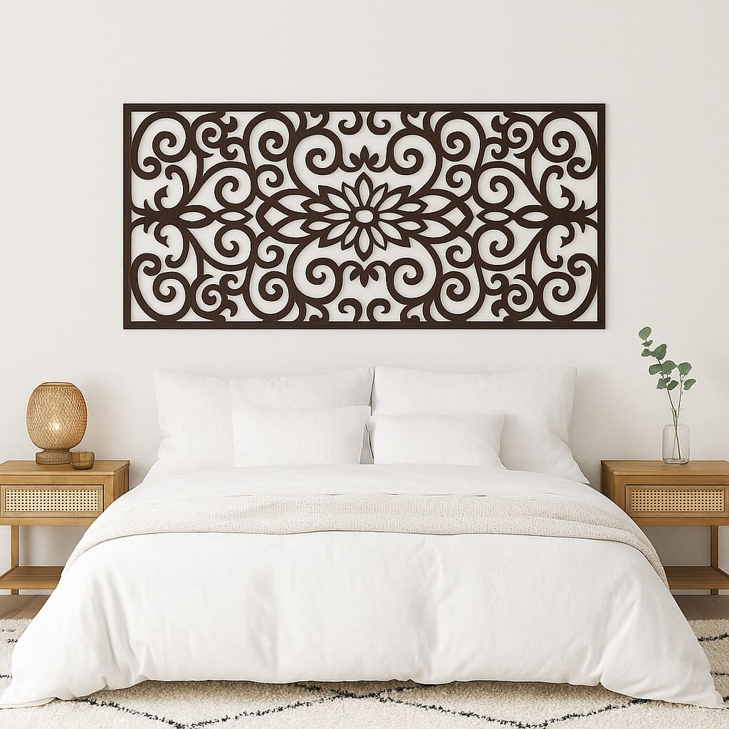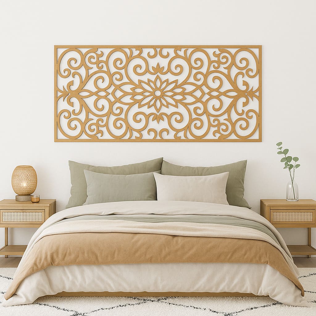 Testiera in stile arabo realizzata con griglia di legno spessa 1 cm. Nuovo design floreale in stile barocco. Ideale per qualsiasi stile d'arredo, moderno, arabo, orientale, naturale, classico, ecc. Design e realizzazione ispirati alla natura e alle piante. Può essere montata orizzontalmente o verticalmente.